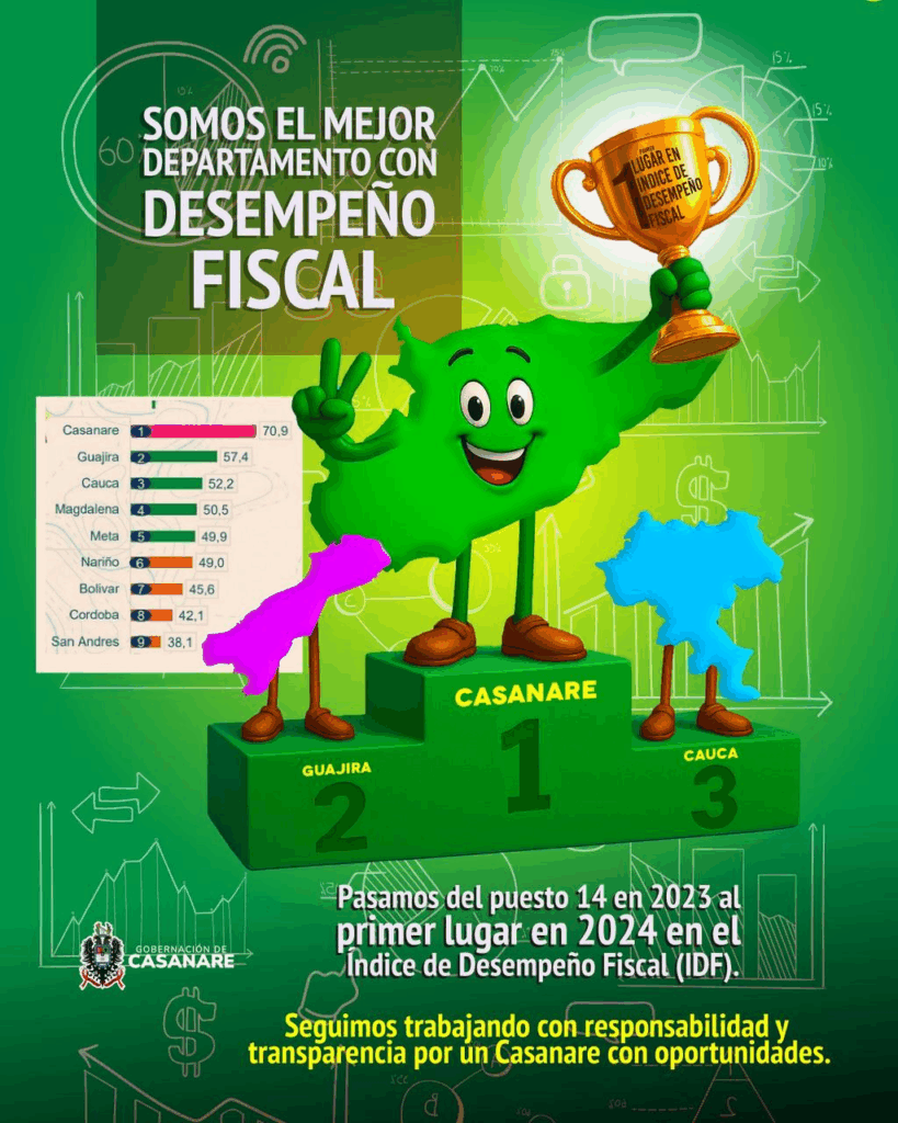 El Departamento Nacional de Planeación (DNP) publicó los resultados del Índice de Desempeño Fiscal (IDF) 2024, y el departamento de Casanare, bajo la administración de César Ortiz Zorro, se ubicó en el primer puesto a nivel nacional con un puntaje de 70,9 puntos, siendo el único del país calificado como “Solvente”.
