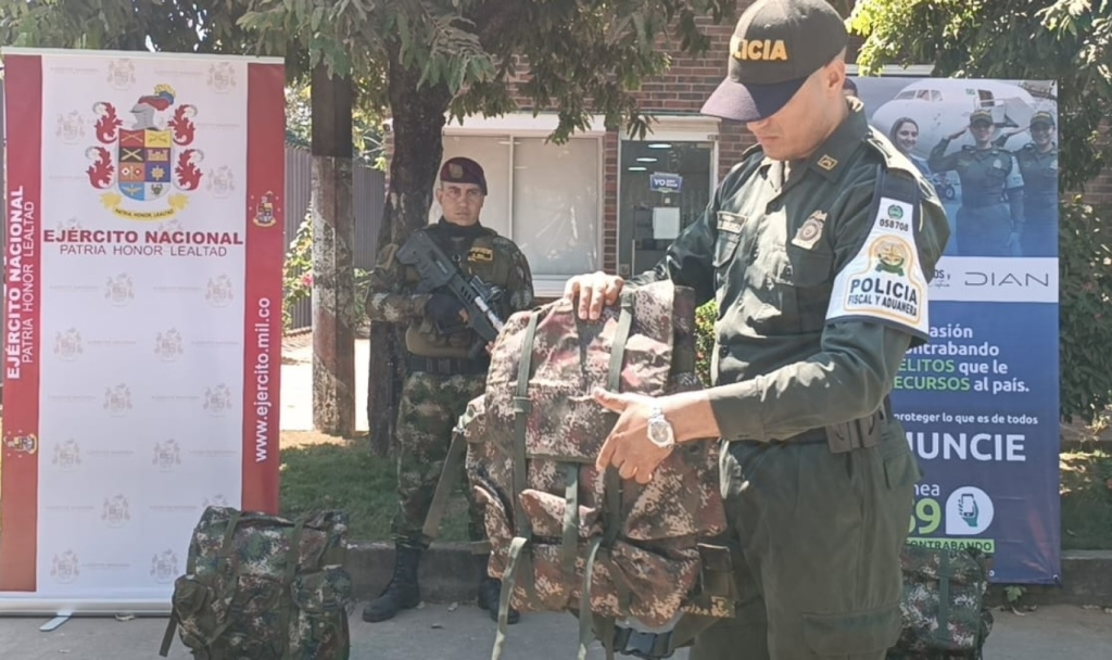 Durante labores de verificación e inspección de mercancías en los corredores viales del departamento de Arauca, se descubrió el transporte ilícito de material militar en dos cajas. El hallazgo incluyó 22 morrales de campaña y 01 chaleco multipropósito táctico de uso exclusivo de las Fuerzas Militares. Estos elementos estaban siendo transportados a través de la modalidad de encomienda en la ruta Cúcuta, Norte de Santander – Arauca, Arauca.