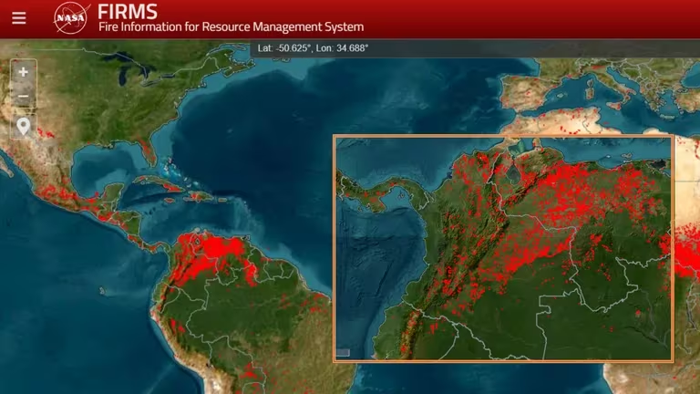 El Sistema de Información sobre Incendios para la Gestión de Recursos, conocido como Firms por sus siglas en inglés (Fire Information for Resources Management System) de la NASA, ha revelado un nuevo mapa en tiempo real que destaca los puntos críticos de calor y conflagraciones alrededor del mundo. Sorprendentemente, se ha identificado una concentración significativa de puntos rojos en Colombia, especialmente en el norte y el centro del país, según informó el presidente Gustavo Petro.